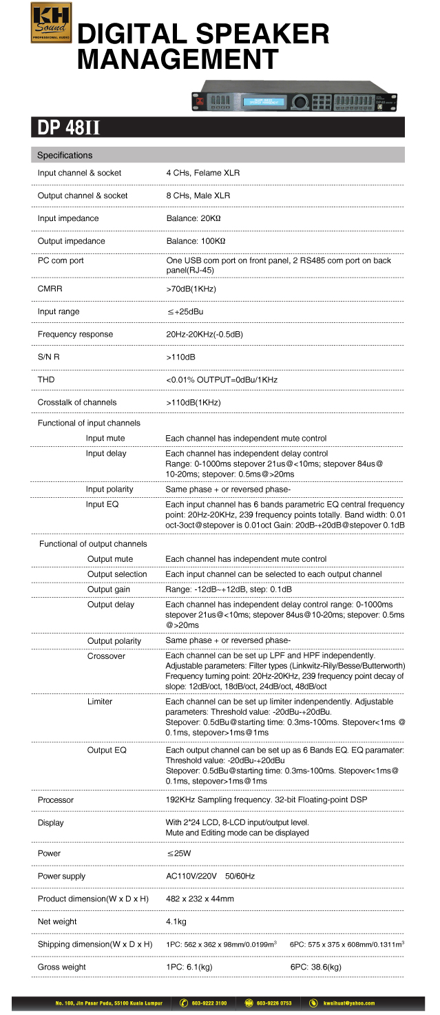 Each input channel has 6 bands parametric EQ central frequency point: 20Hz-20KHz, 239 frequency points totally. Band width: 0.01 oct-3oct@stepover is 0.01oct Gain: 20dB-+20dB@stepover 0.1dB |