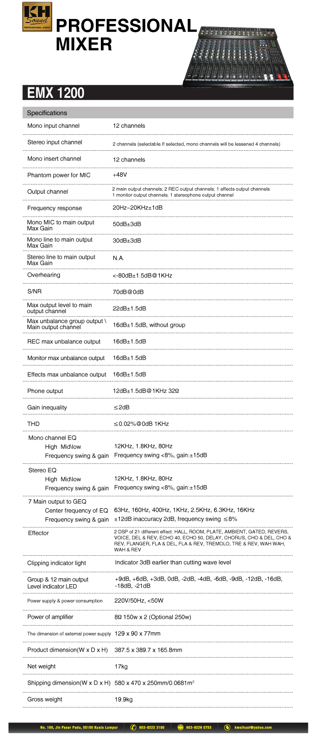 Effector | 2 DSP of 21 different effect: HALL, ROOM, PLATE, AMBIENT, GATED, REVERS, VOICE, DEL & REV, ECHO 40, ECHO 50, DELAY, CHORUS, CHO & DEL, CHO & REV, FLANGER, FLA & DEL, FLA & REV, TREMOLO, TRE & REV, WAH WAH, WAH & REV |